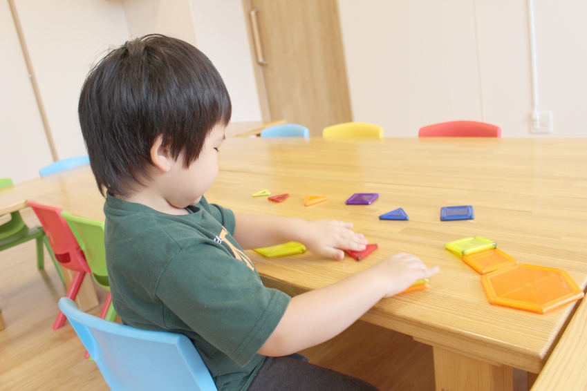 テーブルに向かって集中する時間です。手元をしっかりと見て目を使うこと、細かい作業で指先のトレーニング等、将来大切になる動きの練習を行っています。