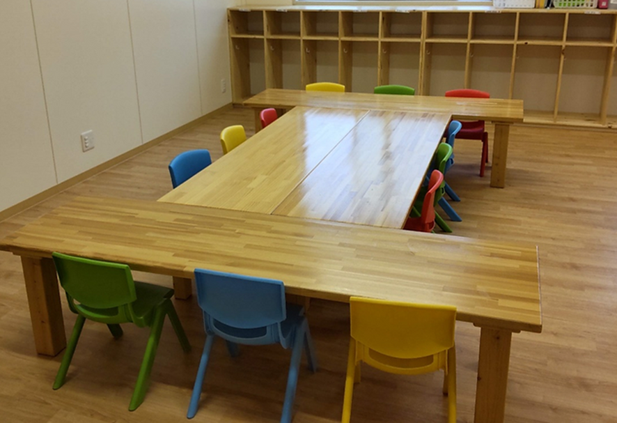 「児童発達支援」で使用されている手作りのテーブルとロッカー