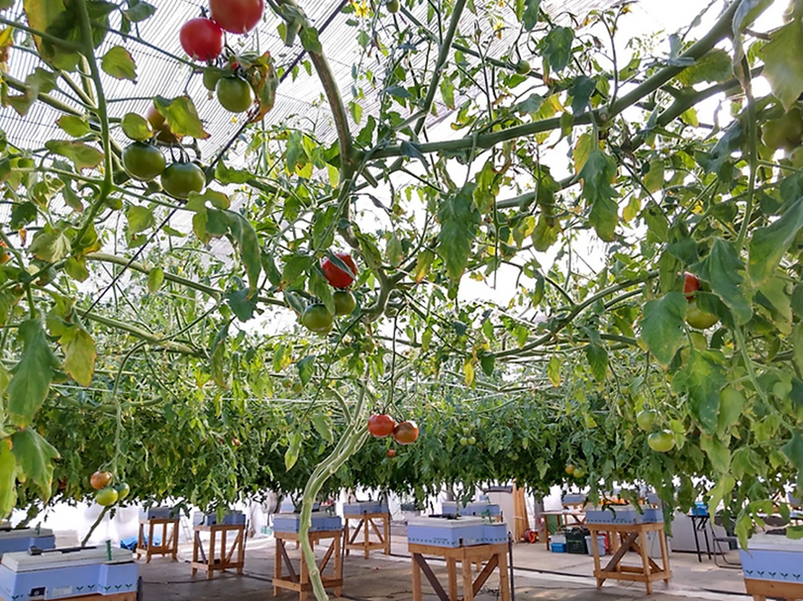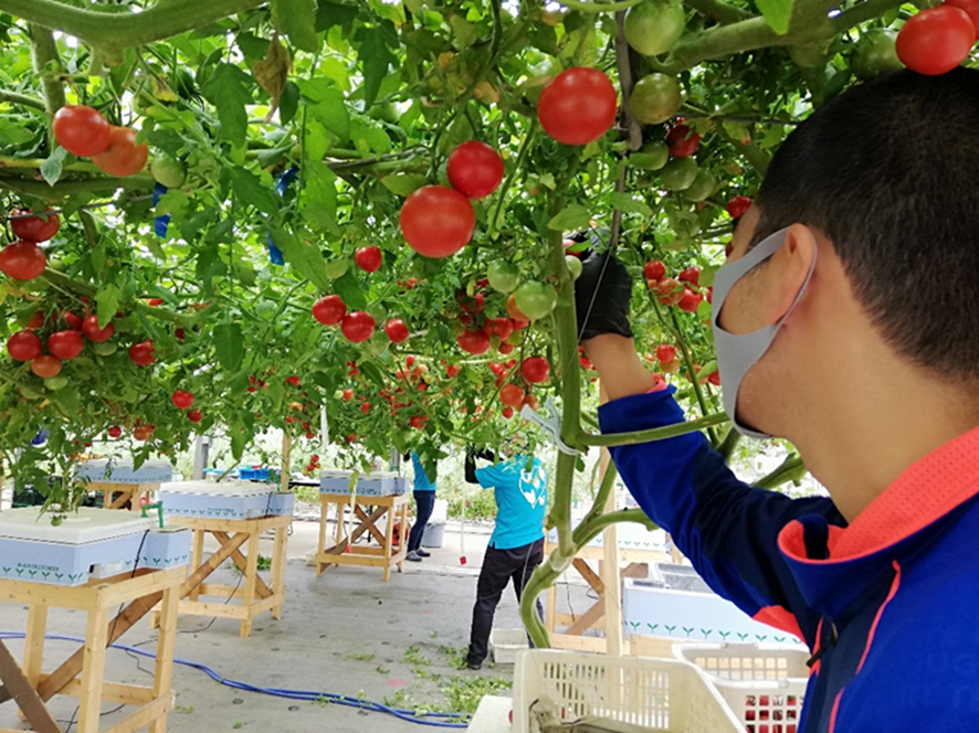 現在、生産しているトマトは、すべて水耕栽培です。 昨年9月、水耕栽培装置に苗を定植。青々とした枝がハウスいっぱいに張り巡り、今年の1月から収穫作業が始まりました。3月から5月にかけて収穫のピークを迎える予定です。