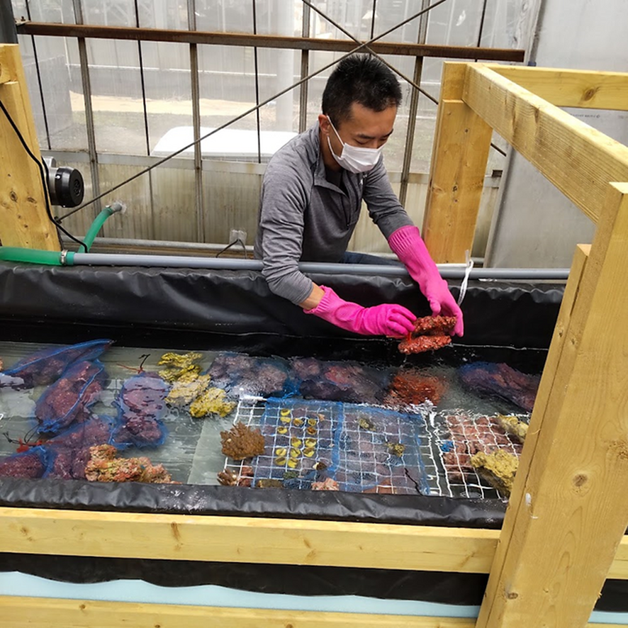 バクテリアで養殖する「人工ライブロック」。水槽は、代表の高橋と二人で製作。