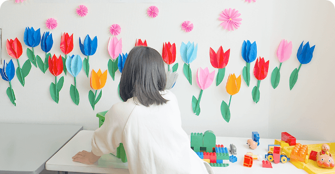 お子様の発達状況に合わせ、ご家族のご意向をうかがいながら個別活動や集団活動に取り組みます。特に、幼児期に必要な粗大運動や微細運動を取り入れ、平衡感覚・ボディイメージの発達を促進し、それに伴い身辺自立(更衣・食事・排泄)を目指します。
